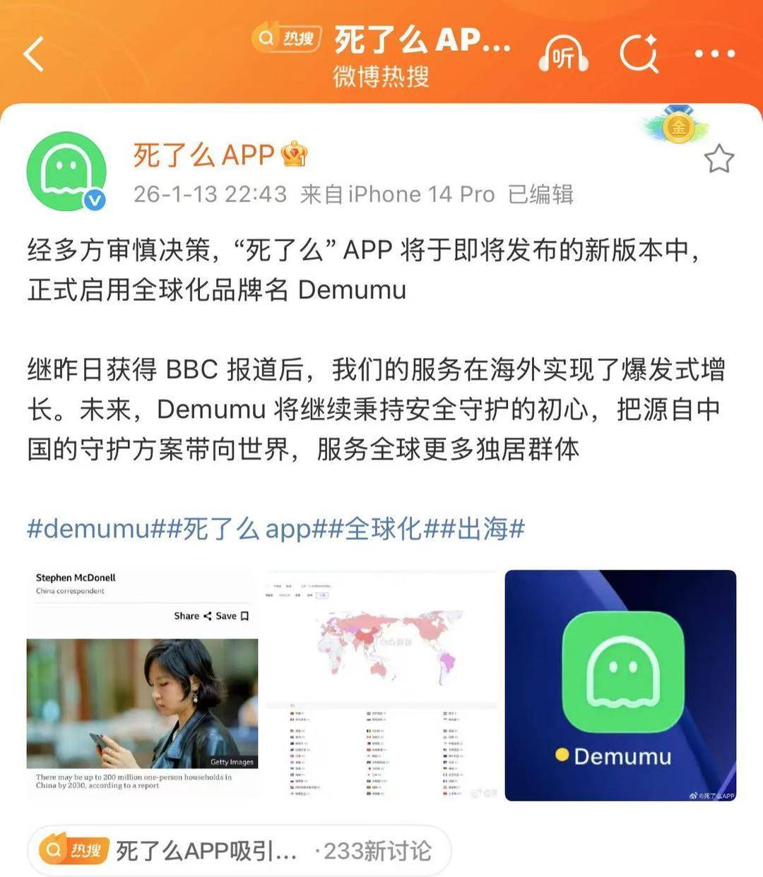 受到众多网友关注后,“死了么”APP官方团队发文回应称,接下来将把主要精力投入到产品打磨中,并探索推出更适老化的新产品。同时,该团队于日前表示,经多方审慎决策,APP将在即将发布的新版本中正式启用全球化品牌名Demumu。