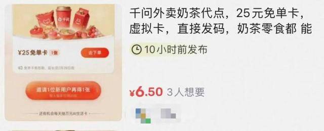 2月7日,记者观察到,有人在二手交易平台上卖起了千问奶茶,售价6元至10元不等,声称只需提供收货地址和电话,即可代顾客下单购买。