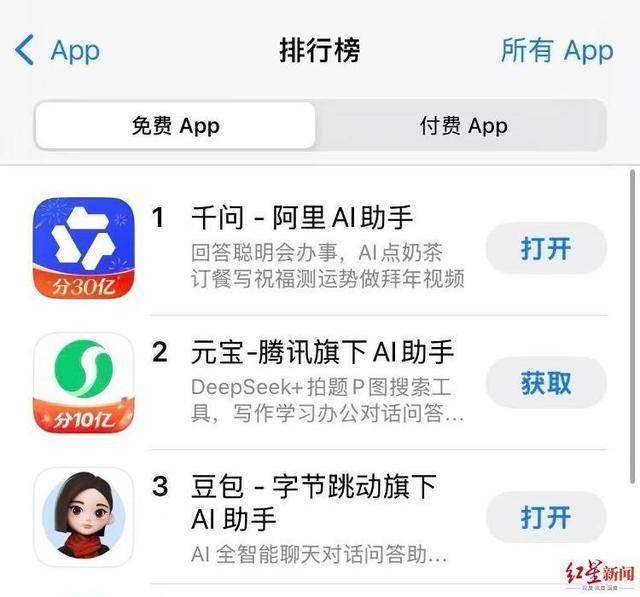 “奶茶狂欢”让千问迅速突围,2月7日登顶苹果App Store免费应用榜,第二名是腾讯旗下的元宝,第三名是字节旗下的豆包。