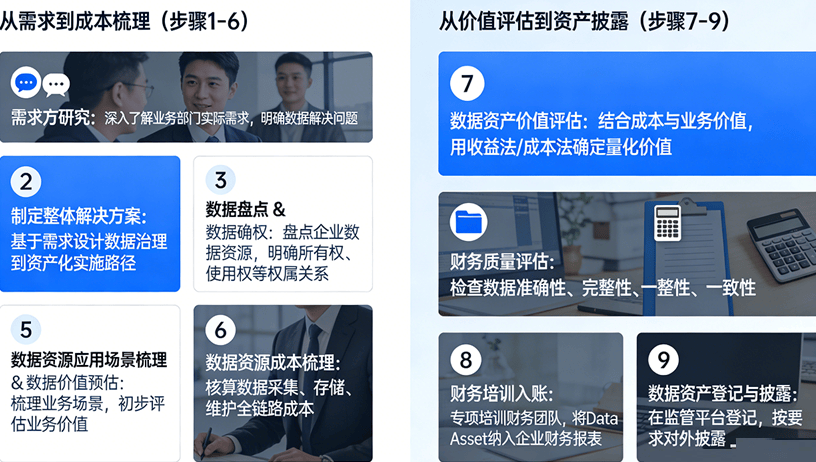数据资产化可遵循15步全流程实施路径,从数据生产与采集开始,经过数据资产盘点、数据分级分类、数据场景设计、数据产品加工、数据合规审查、数据安全风险评估、数据质量评价、数据资产价值评估、数据资产登记、数据资源入表、数据台账编制、数据产品流通、数据流通存证、数据安全管理,最终完成数据资产运营。